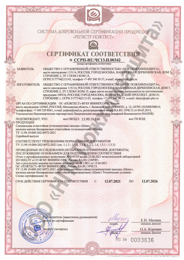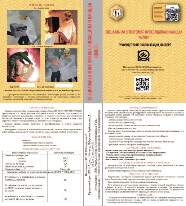 - Специальная огнестойкая (огнезащитная) накидка «Шанс» выполнена в виде пончо из водо-, огнетермостойкой стеклоткани с фторопластовой пропиткой, для минимизации дымообразования.